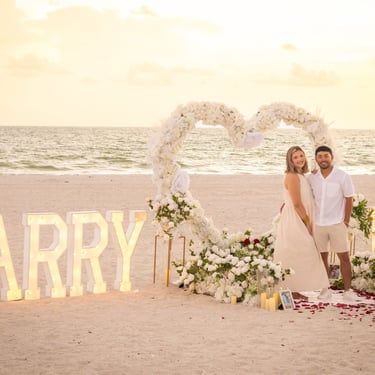 Mix and match elements like large "Marry Me" letters, archways, or a professional engagement photographer — available across Central Florida beaches.