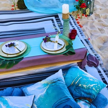 Cozy, elegant beach picnic proposals with rugs, pillows, candles, and floral accents — ideal for intimate moments on the sand.Surprise Proposal Planning